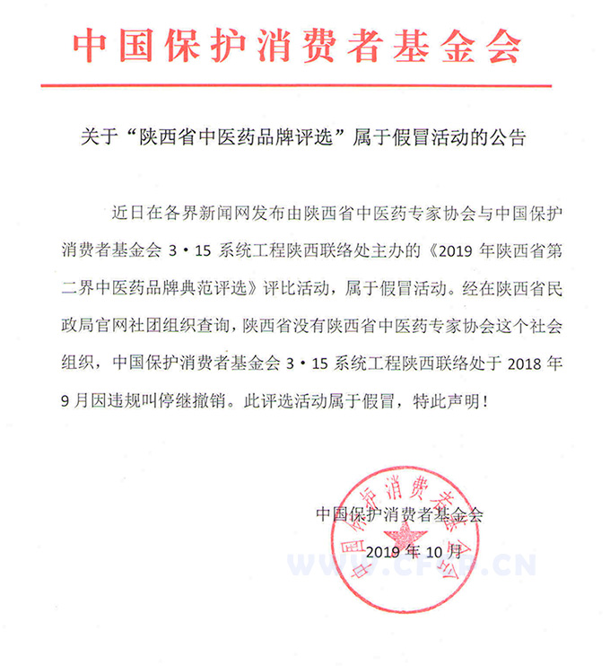中國保護消費者基金會關于“陜西省中醫(yī)藥品牌評選”屬于假冒活動的公告